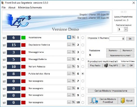 • Gestisce un numero infinito di postazioni (10 contemporaneamente)• Layouts predefiniti già pronti all’uso• Gestisce risoluzioni fino al Full HD (1024x768/1366x768/1920x1080)• Possibilità di gestire numerazioni individuali o condivise contemporaneamente• Personalizzazione grafica monitor in sala di attesa e monitor distributore ticket (se presente)• Intrattenimento multimediale attraverso contenuti d’informazione come notizie ANSA e meteo• Visualizza playlist di video, di immagini e youtube• Riproduzione Radio e cartelle Mp3• Chiamata vocale personalizzabile e/o avvisatore acustico• Visualizza testo scorrevole• Esecuzione automatica output per postazioni non presidiate• Controllo del numero di persone in attesa da sportello (se si utilizza il software EC3Totem)• Possibilità multipla di gestione delle code in diverse sale di attesa attraverso più schermi• Modulo agenda per assegnazione del numero e gestione delle code tramite appuntamento• Stampa ticket da segreteria, agenda o totem
